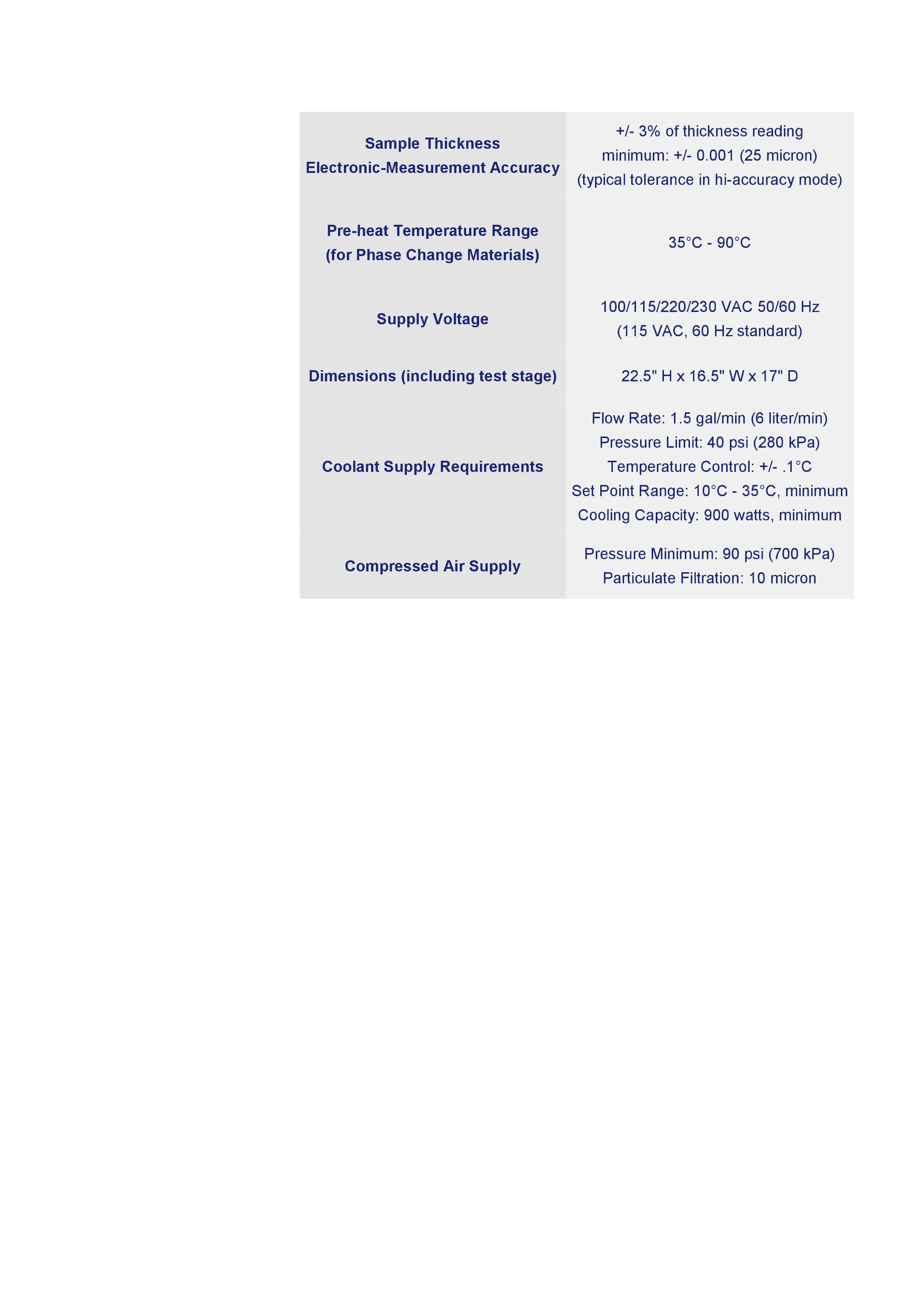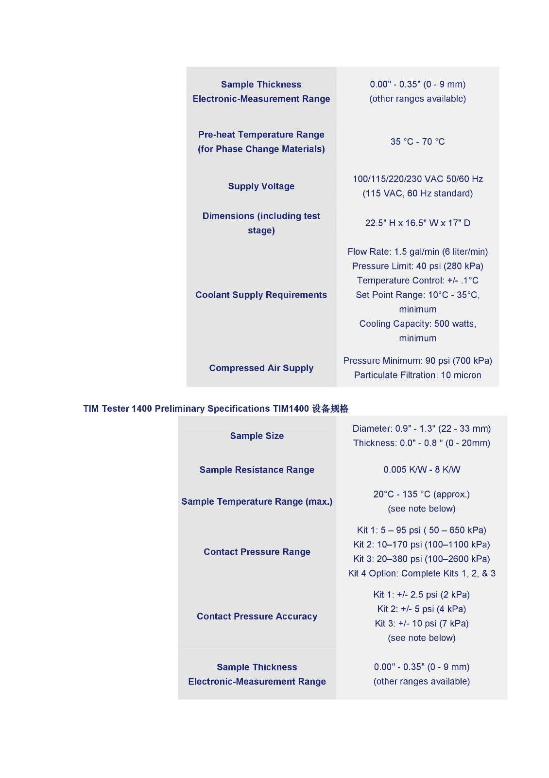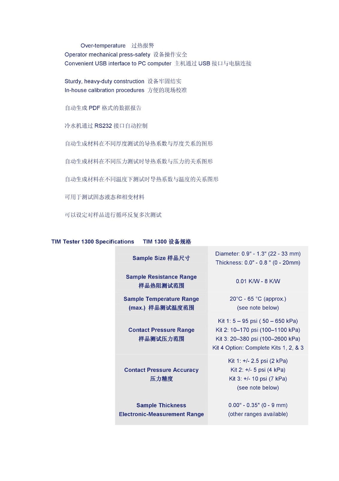 Anatech 的TIM Tester 1300,1400是一套自動測量系統(tǒng),用來測量那些電子封裝材料和多種柔性的,堅硬的,半固狀的和粘稠狀的材料熱阻抗和熱導率需要測量的樣品被夾在兩個平行執(zhí)行熱傳導的平面中間,一端是被加熱的,另一端是被冷卻的,這樣可以迫使可測量的熱量通過樣品。精確的穿過樣品熱量和樣品上下表面溫差的測量給熱導率的測量提供基礎。一般的樣品溫度和加緊壓力是自動控制的基于使用者所選的數(shù)值。接觸壓力變化對熱導率的影響可以通過Pressure-batch操作模式很容易看出。